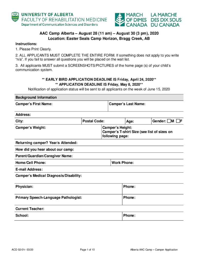 AAC Camp Alberta August 28 (11 am) August 30 (3 pm), 2020 Location: Easter Seals Camp Horizon, Bragg Creek, AB Instructions: 1. Please Print Clearly. 2. ALL APPLICANTS MUST COMPLETE THE ENTIRE FORM.