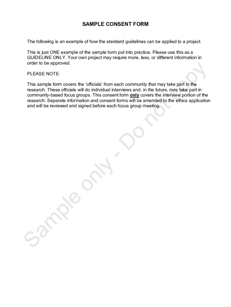 SAMPLE CONSENT FORM The following is an example of how the standard guidelines can be applied to a project. This is just ONE example of the sample form put into practice. Please use this as a GUIDELINE