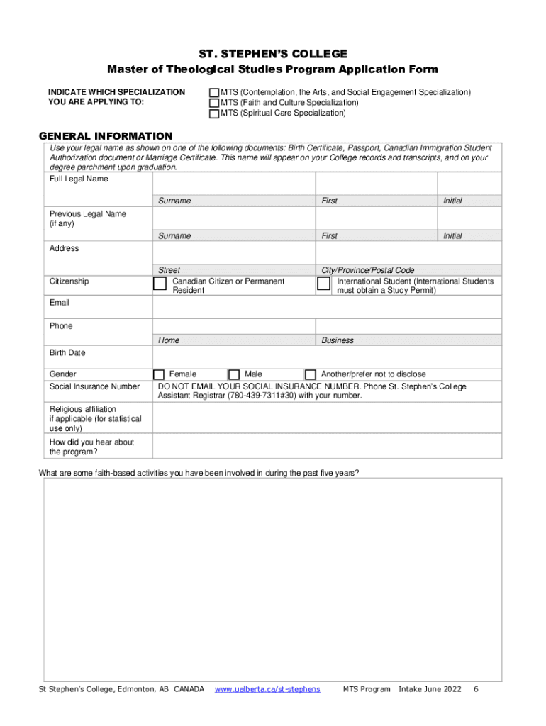MASTER OF THEOLOGICAL STUDIES Contemplation, the Arts, and Social Engagement Specialization Faith and Culture Specialization Spiritual Care SpecializationApplication for Admissions STEPHENS COLLEGE,