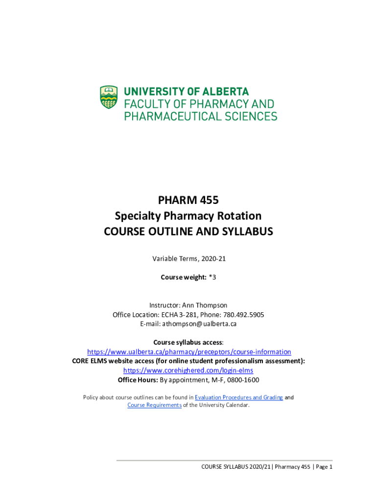 Get the free PHARM 455 Specialty Pharmacy Rotation COURSE OUTLINE AND SYLLABUS