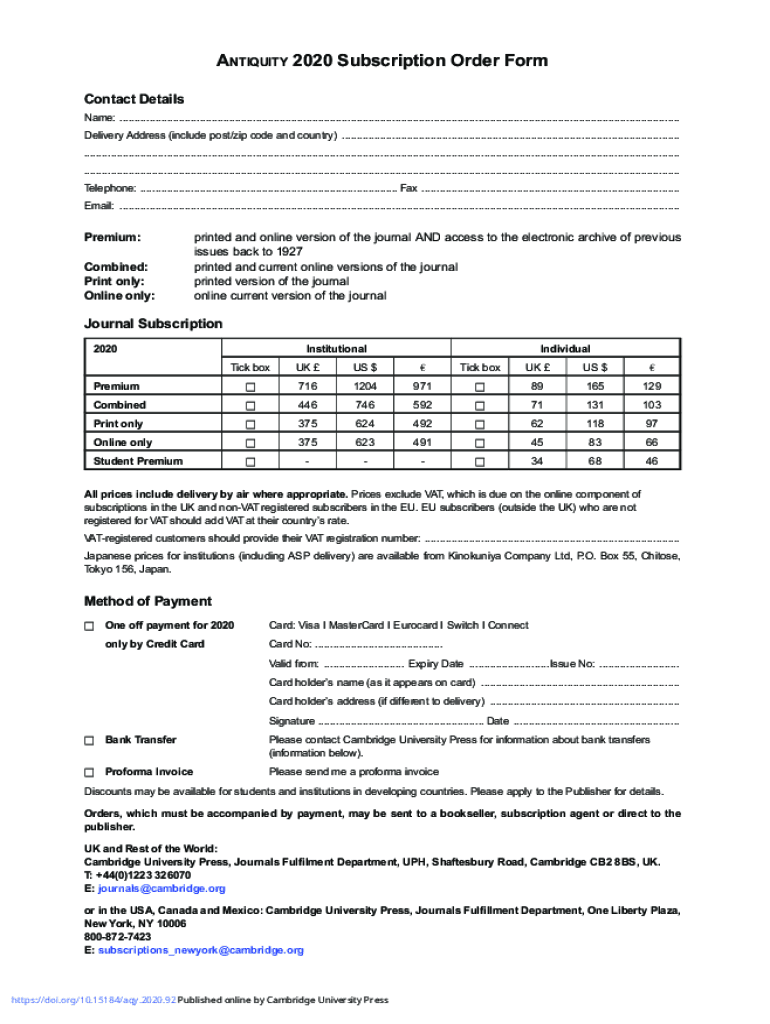 ANTIQUITY 2020 Subscription Order Form Contact Details Name: .............................................................................................................................................................................................