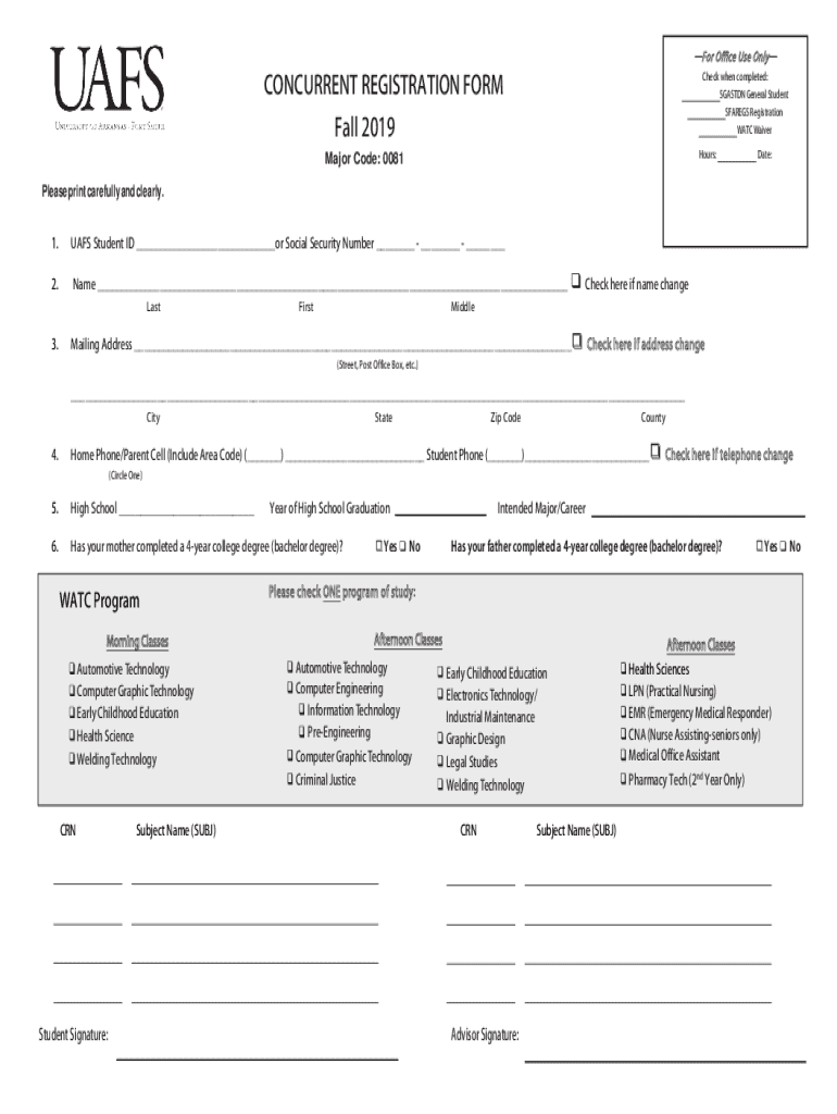 For Office Use Only Check when completed:CONCURRENT REGISTRATION FORMSGASTDN General Student SHARES RegistrationFall 2019WATC Waiver Hours:Major Code: 0081Date:Please print carefully and clearly.