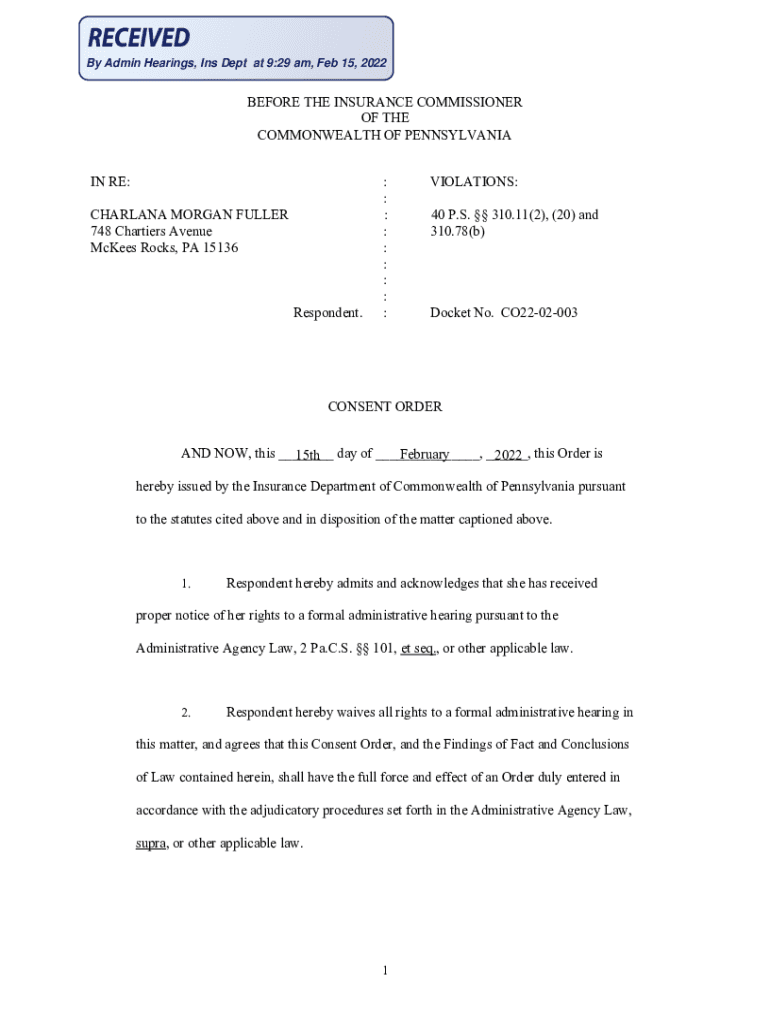 By Admin Hearings, Ins Dept at 9:29 am, Feb 15, 2022BEFORE THE INSURANCE COMMISSIONER OF THE COMMONWEALTH OF PENNSYLVANIA IN RE: HARLAN MORGAN FULLER 748 Charters Avenue McKee's Rocks, PA 15136Respondent.: