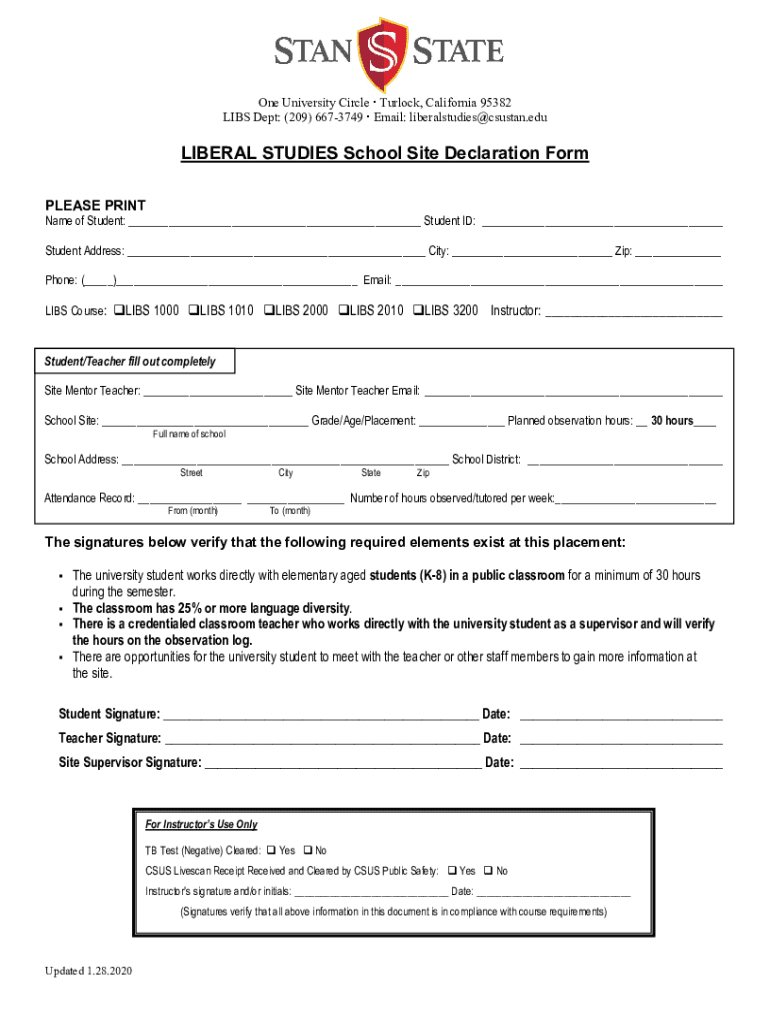 One University Circle Turlock, California 95382 LIES Dept: (209) 6673749 Email: liberalstudies@csustan.eduLIBERAL STUDIES School Site Declaration Form PLEASE Printable of Student: ___ Student ID: