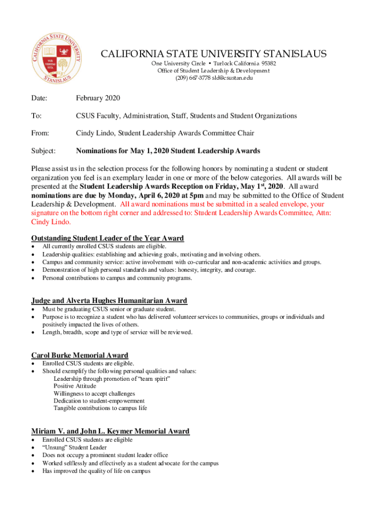Get the free Nominations for May 1, 2020 Student Leadership Awards