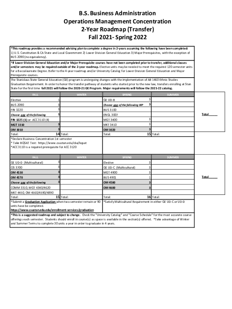 B.S. Business Administration Operations Management Concentration 2Year Roadmap (Transfer) Fall 2021 Spring 2022 *This roadmap provides a recommended advising plan to complete a degree in 2years assuming