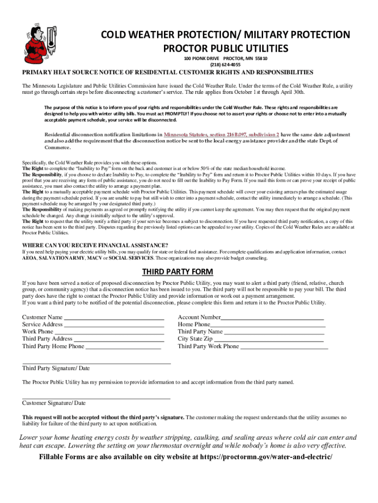 COLD WEATHER PROTECTION/ MILITARY PROTECTION PROCTOR PUBLIC UTILITIES 100 PINK DRIVE PROCTOR, MN 55810 (218) 6244055PRIMARY HEAT SOURCE NOTICE OF RESIDENTIAL CUSTOMER RIGHTS AND RESPONSIBILITIES The