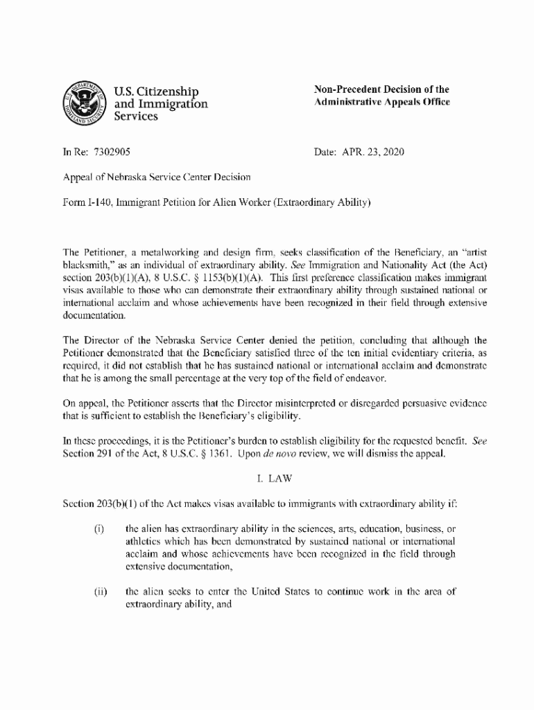 Precedent Decision of the Administrative Appeals Office. S. Citizenship and Immigration Services In Re: 7302905Date: APR. 23, 2020Appeal of Nebraska Service Center Decision Form 1140, Immigrant Petition