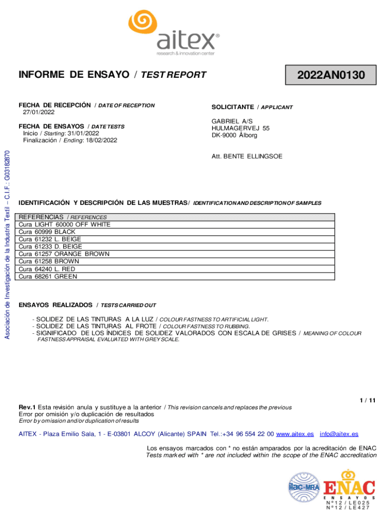 2022AN0130INFORME DE ENS AYO / TEST REPORT FEC HA DE RECEPTION / DATE OF RECEPTION 27/01/2022GABRIEL A/S HULMAGERVEJ 55 DK9000 lborgFECHA DE ESSAYS / DATE TESTS Initio / Starting : 31/01/2022 Finalization