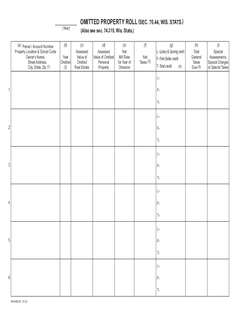(Year) (a) Parcel / Account Number Property Location & School Code Owners Name, Street Address, City, State, Zip (1)(b) Year Omitted (2)OMITTED PROPERTY ROLL (SEC. 70.44, WIS. STATS.) (Also see sec.