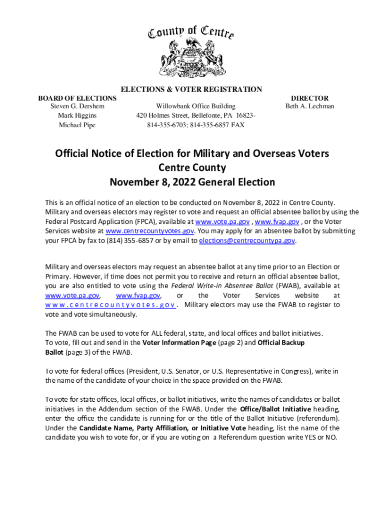 Get the free Official Notice of Election for Military and Overseas Voters Centre ...