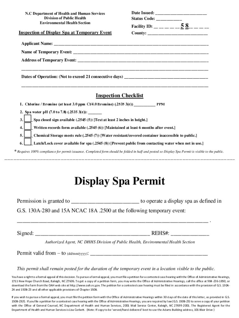 N. C Department of Health and Human Services Division of Public Health Environmental Health SectionInspection of Display Spa at Temporary Eventuate Issued: ___ Status Code: ___ Facility ID: __ __