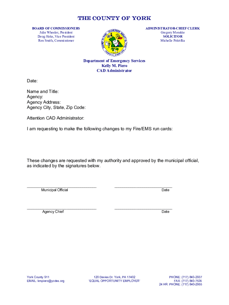 The County of York BOARD OF COMMISSIONERS Julie Wheeler, President Doug Hoke, Vice President Ron Smith, CommissionerADMINISTRATORCHIEF CLERK Gregory Muskie SOLICITOR Michelle PokrifkaDepartment of