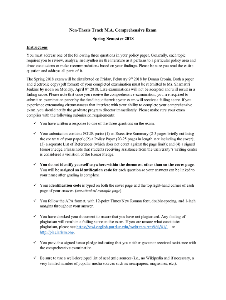 Get the free Non-Thesis Track M.A. Comprehensive Exam Spring ...