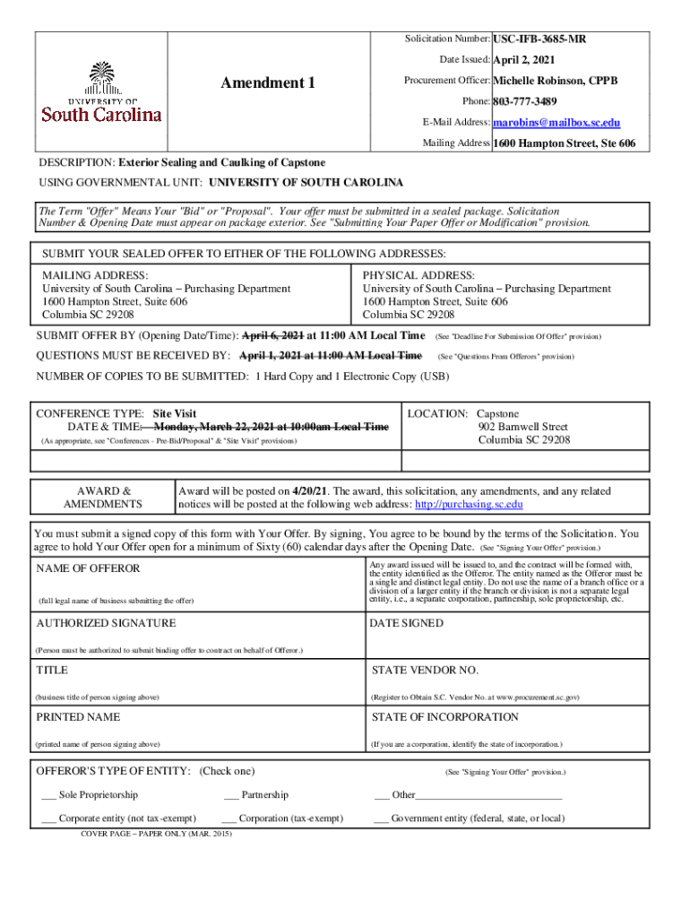 Solicitation Number: USCIFB3685MR Date Issued: April 2, 2021, Procurement Officer: Michelle Robinson, CPPBAmendment 1Phone: 8037773489 Email Address: marobins@mailbox.sc.edu Mailing Address 1600 Hampton
