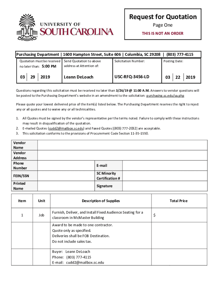 Request for Quotation Page One THIS IS NOT AN Repurchasing Department | 1600 Hampton Street, Suite 606 | Columbia, SC 29208 | (803) 7774115 Quotation must be received no later than: 5:00 PMS end Quotation