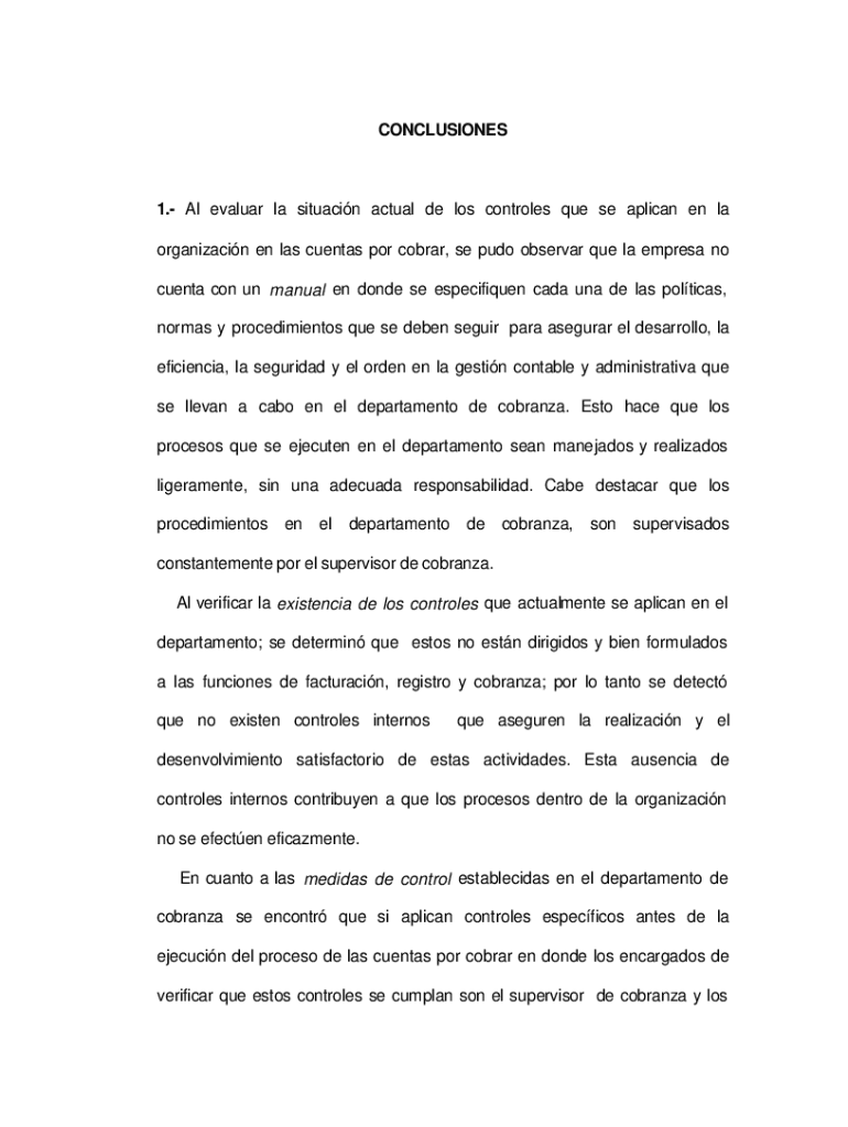CONCLUSIONES1. Al evaluates la situation actual de Los controls Que SE African en la organization en leis cents POR cobra, SE judo observer Que la empress no cent con UN manual en done SE especifiquen