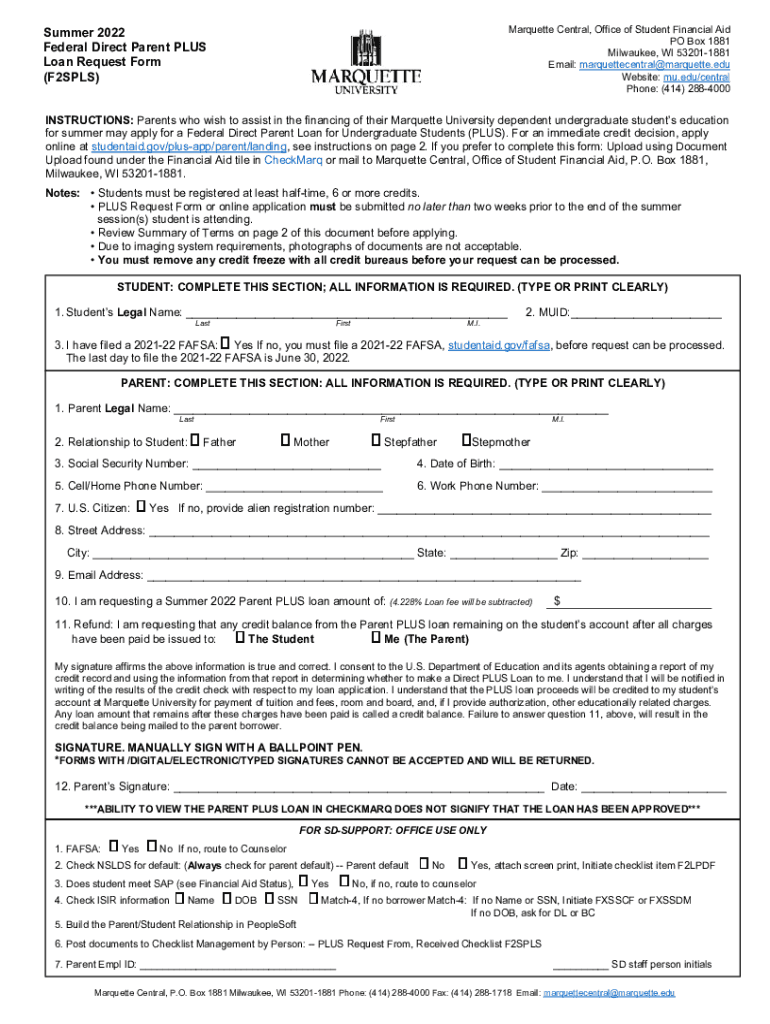 Marquette Central, Office of Student Financial Aid PO Box 1881 Milwaukee, WI 532011881 Email: marquettecentral@marquette.edu Website: mu.edu/central Phone: (414) 2884000Summer 2022 Federal Direct