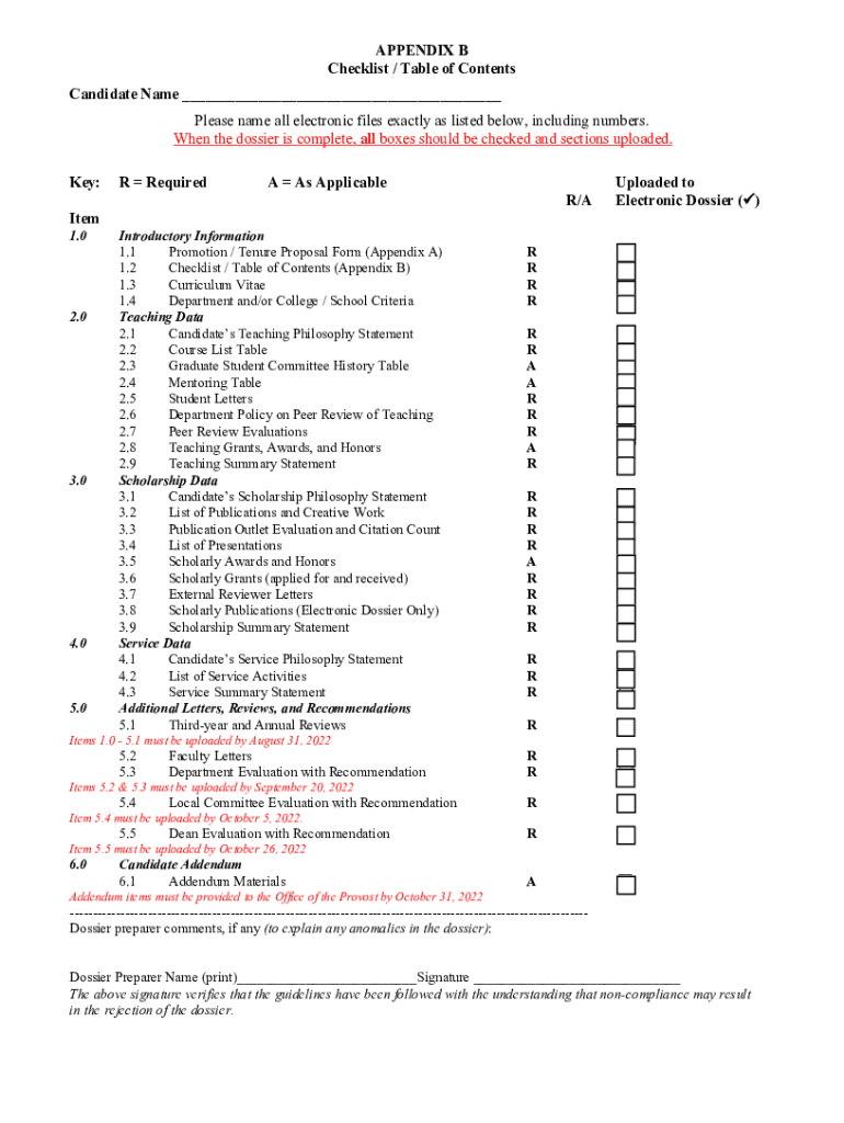 APPENDIX B Checklist / Table of Contents Candidate Name ___ Please name all electronic files exactly as listed below, including numbers. When the dossier is complete, all boxes should be checked and