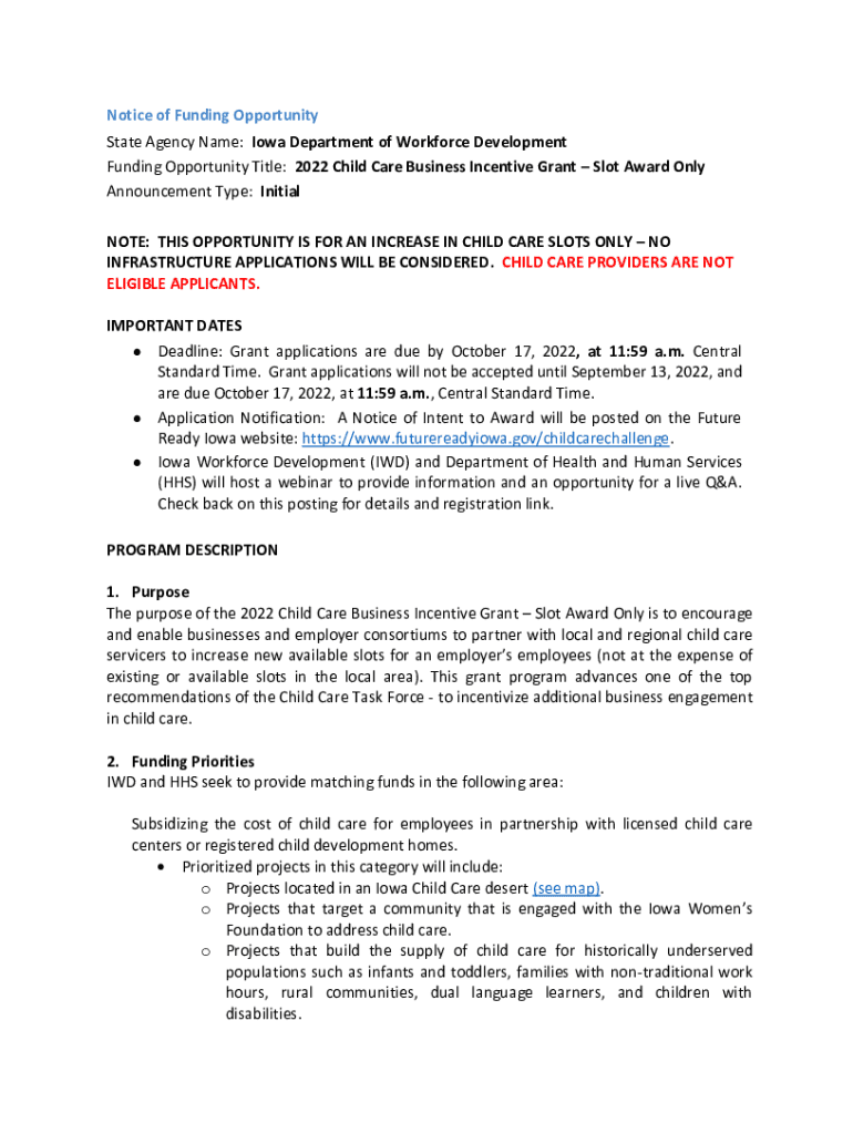 Notice of Funding Opportunity State Agency Name: Iowa Department of Workforce Development Funding Opportunity Title: 2022 Child Care Business Incentive Grant Slot Award Only Announcement Type: Initial