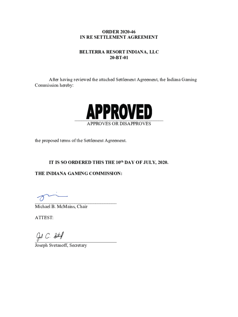 ORDER 202046 IN RE SETTLEMENT AGREEMENT BECERRA RESORT INDIANA, LLC 20BT01After having reviewed the attached Settlement Agreement, the Indiana Gaming Commission hereby:___ APPROVES OR DISAPPROVES