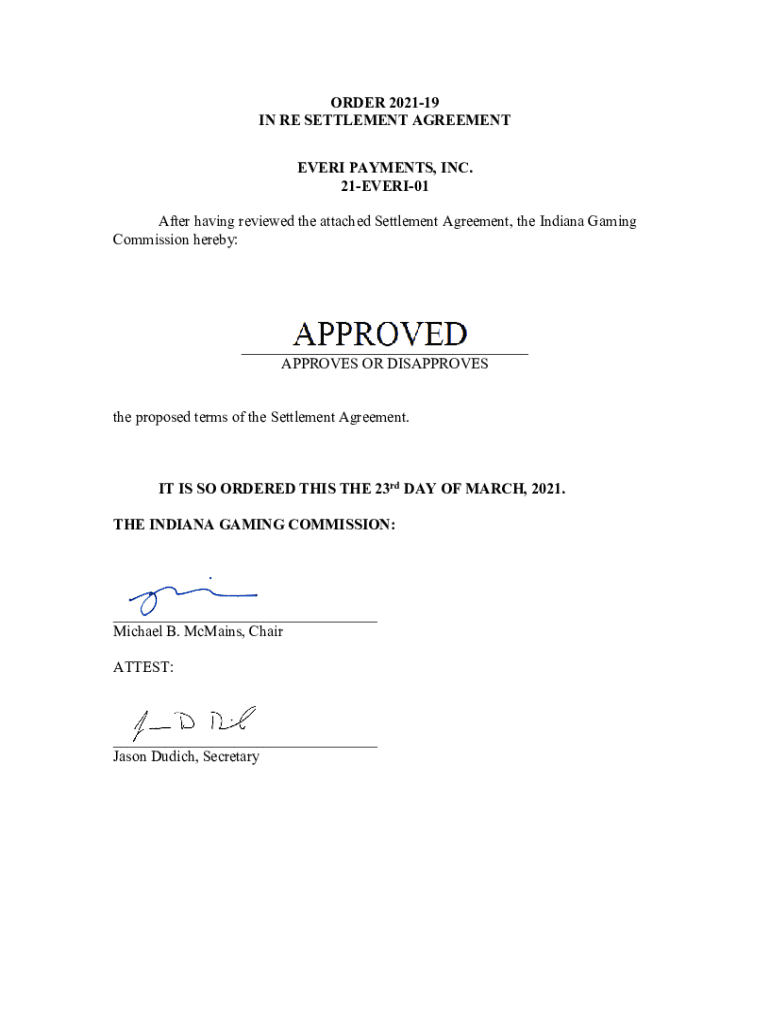 ORDER 202119 IN RE SETTLEMENT AGREEMENT EVERY Payment, INC. 21EVERI01 After having reviewed the attached Settlement Agreement, the Indiana Gaming Commission hereby:___ APPROVES OR DISAPPROVES the