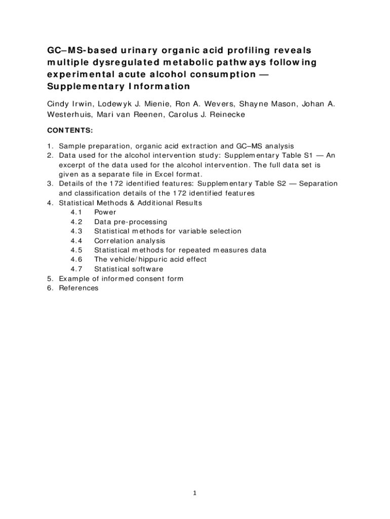GCMSbased urinary organic acid profiling reveals multiple deregulated metabolic pathways following experimental acute alcohol consumption Supplementary Information Cindy Irwin, Lonely J. Maine, Ron