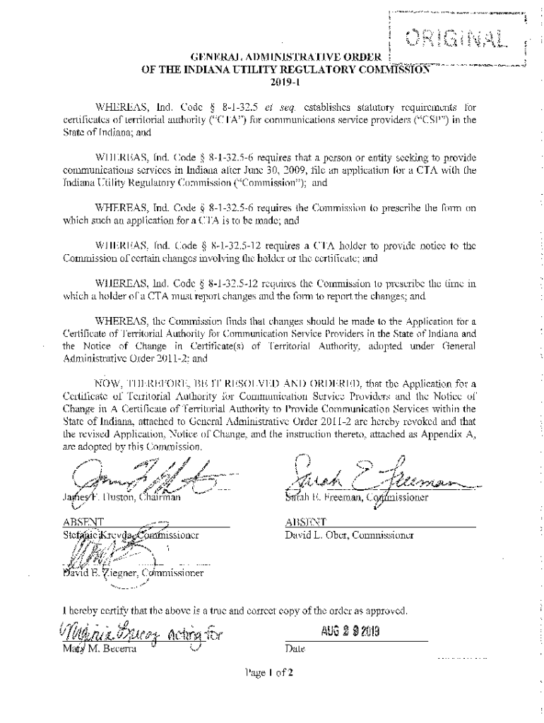 II ORIGINALGENERAL ADMINISTRATIVE ORDER. OF THE INDIANA UTILITY REGULATORY COMMISSION 20191WHEREAS, Ind. Code 8132.5 et seq. Establishes statutory requirements for certificates of territorial authority