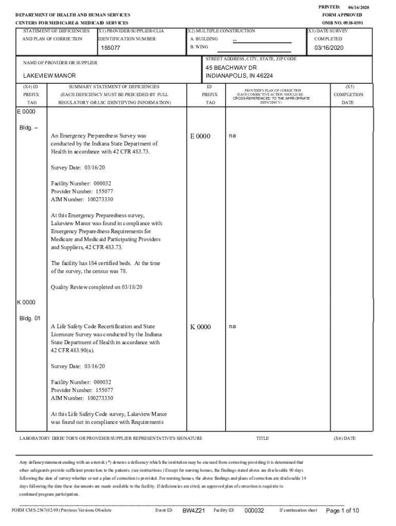 PRINTED: DEPARTMENT OF HEALTH AND HUMAN SERVICES CENTERS FOR MEDICARE & MEDICAID SERVICES STATEMENT OF DEFICIENCIES(X1) PROVIDER/SUPPLIER/LIGAND PLAN OF CORRECTIONIDENTIFICATION NUMBER:15507706/16/2020FORM