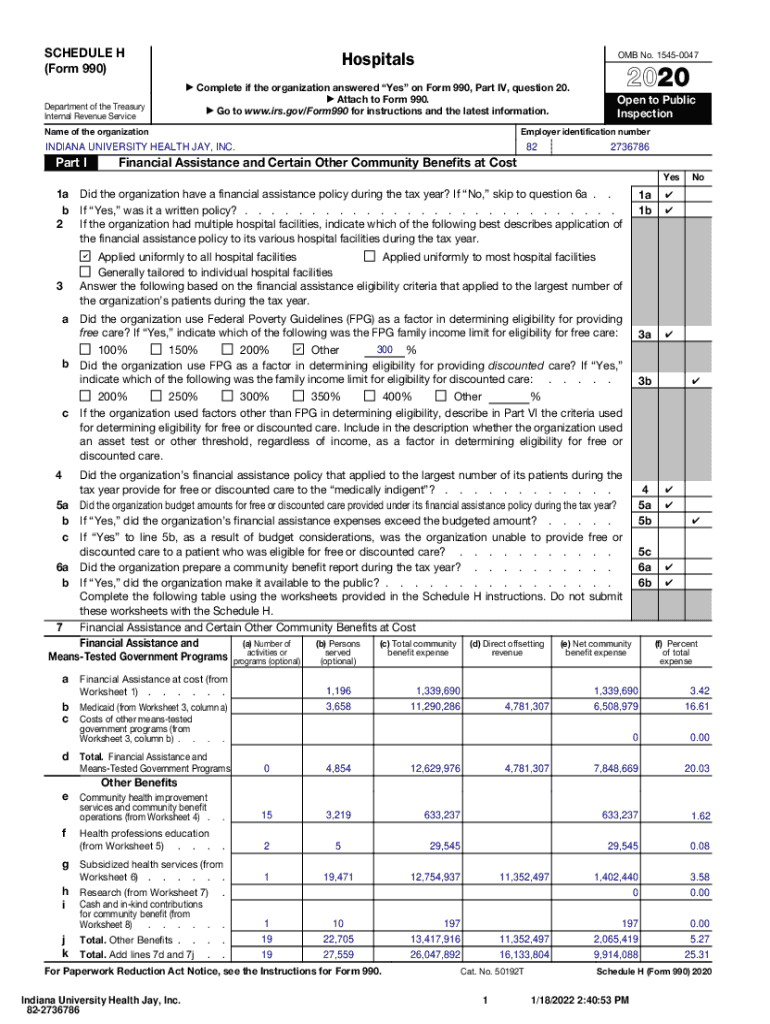 SCHEDULE H (Form 990)Hospitals Department of the Treasury Internal Revenue Service OMB No. 15450047Complete if the organization answered Yes on Form 990, Part IV, question 20. Attach to Form 990.
