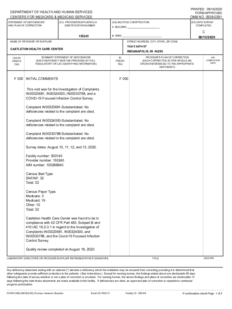 Get the free PRINTED: 08/19/2020 DEPARTMENT OF HEALTH AND HUMAN SERVICES CENTERS FOR ...