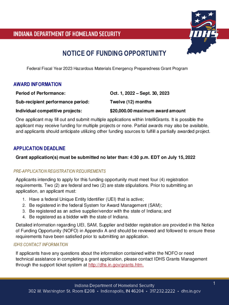 NOTICE OF FUNDING OPPORTUNITY Federal Fiscal Year 2023 Hazardous Materials Emergency Preparedness Grant ProgramAWARD INFORMATION Period of Performance:Oct. 1, 2022 Sept. 30, 2023Subrecipient performance