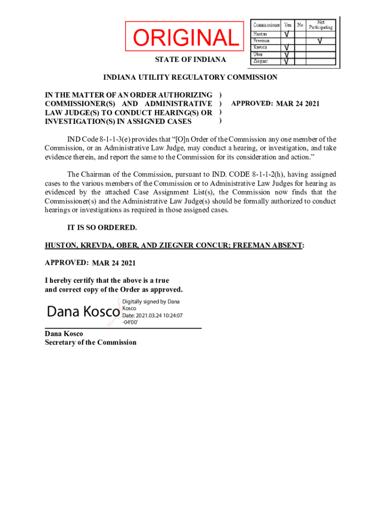 ORIGINAL STATE OF INDIANACommissioner You Huston Freeman KrevdaOber Z1egne1 Monotheistic.APA. Indiana UTILITY REGULATORY COMMISSION IN THE MATTER OF AN ORDER AUTHORIZING COMMISSIONER(S) AND ADMINISTRATIVE