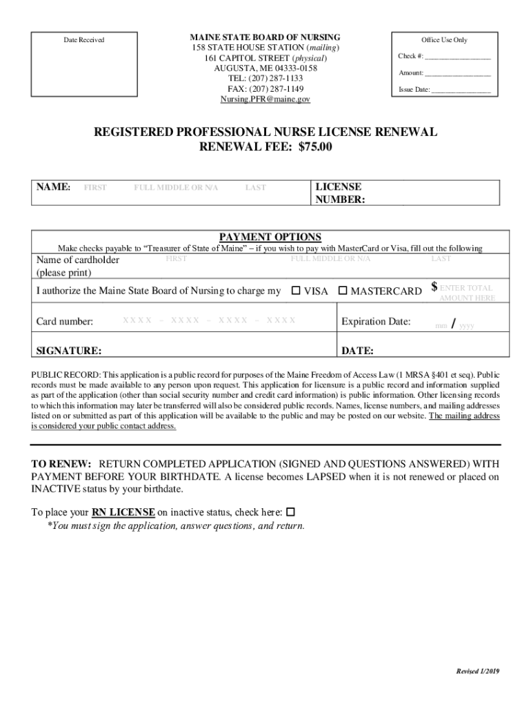 MAINE STATE BOARD OF NURSING 158 STATE HOUSE STATION (mailing) 161 CAPITOL STREET (physical) AUGUSTA, ME 043330158 TEL: (207) 2871133 FAX: (207) 2871149 Nursing.PFR@maine.govDate ReceivedOffice Use