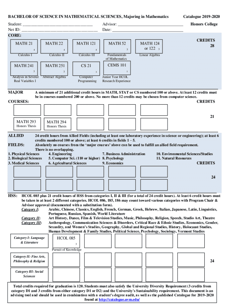 BACHELOR OF SCIENCE IN MATHEMATICAL SCIENCES, Majoring in Mathematics Student: ___ Net ID: ___ CORE: MATH 21MATH 22 44Calculus MATH 25133Calculus Fundamentals of Mathematics CS 21CEMS 1013Analysis