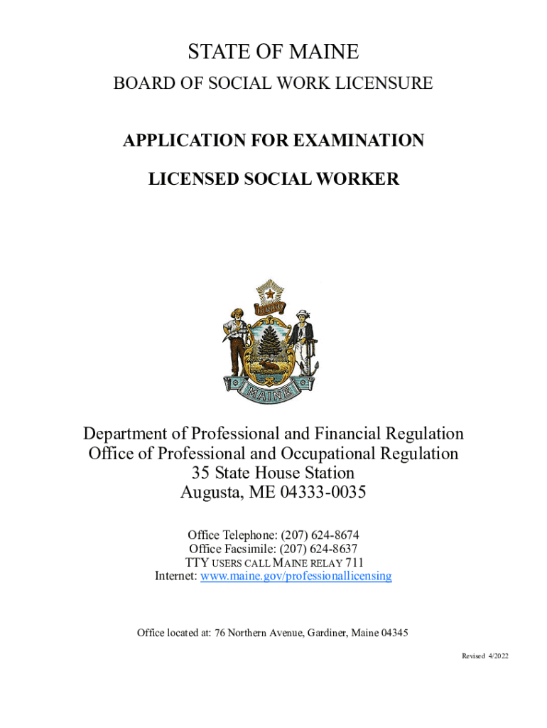 STATE OF MAINE BOARD OF SOCIAL WORK LICENSURE APPLICATION FOR EXAMINATION LICENSED SOCIAL WORKERDepartment of Professional and Financial Regulation Office of Professional and Occupational Regulation