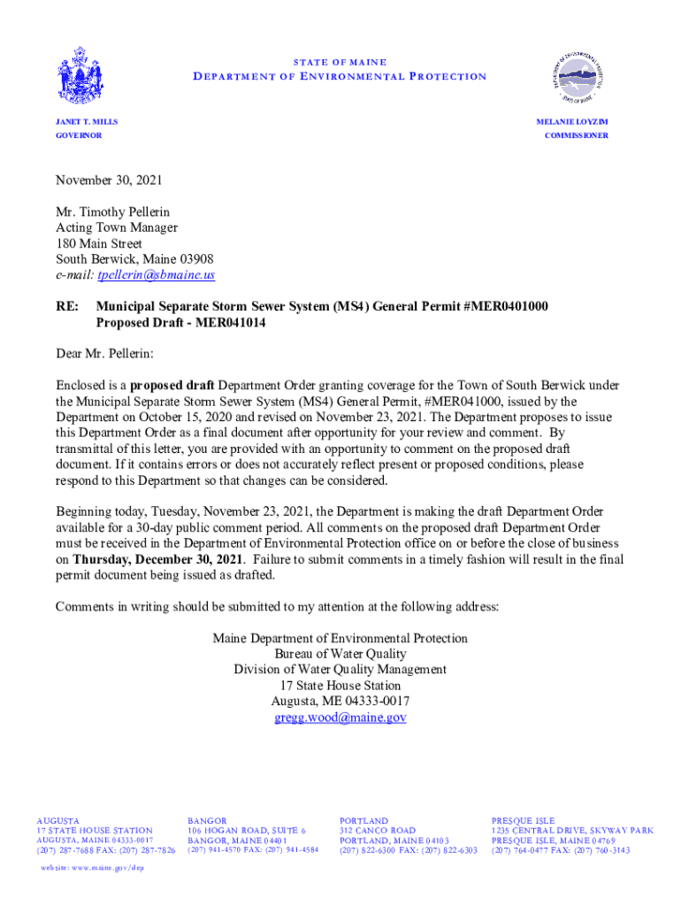 STATE OF MAINEDEPARTMENT OF ENVIRONMENTAL PROTECTIONJANET T. MILLSMELANIE LOYZIMGOVERNORCOMMISSIONERNovember 30, 2021