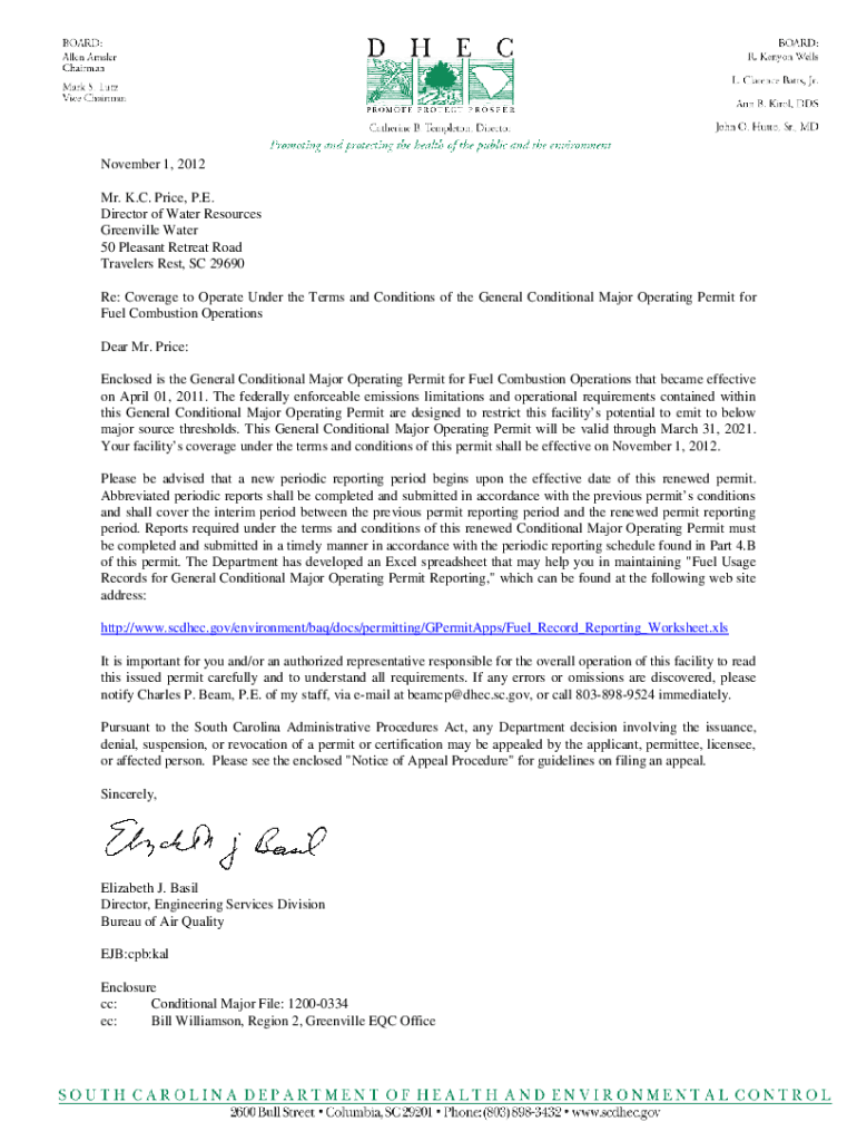 November 1, 2012, Mr. K.C. Price, P.E. Director of Water Resources Greenville Water 50 Pleasant Retreat Road Travelers Rest, SC 29690 Re: Coverage to Operate Under the Terms and Conditions of the