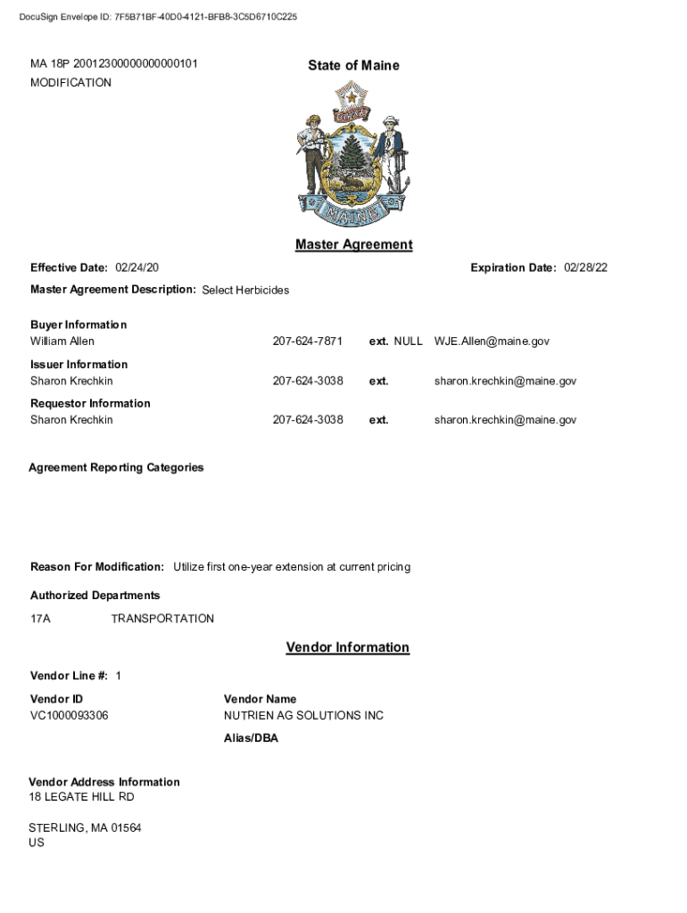 DocuSign Envelope ID: 7F5B71BF40D04121BFB83C5D6710C225MA 18P 20012300000000000101State of MaineMODIFICATIONMaster Agreement Effective Date: 02/24/20Expiration Date: 02/28/22Master Agreement Description: