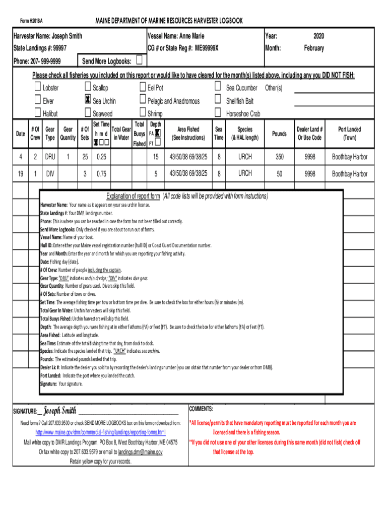 MAINE DEPARTMENT OF MARINE RESOURCES HARVESTER LOGBOOKForm H2018AHarvester Name: Joseph Smith