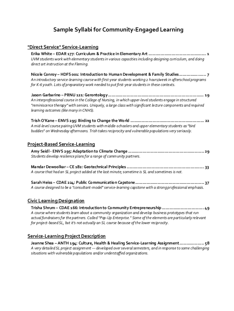 Sample Syllabi for CommunityEngaged Learning \” Direct Service\” ServiceLearning Erika White EAR 177: Curriculum & Practice in Elementary Art. 1 UVM students work with elementary students in various