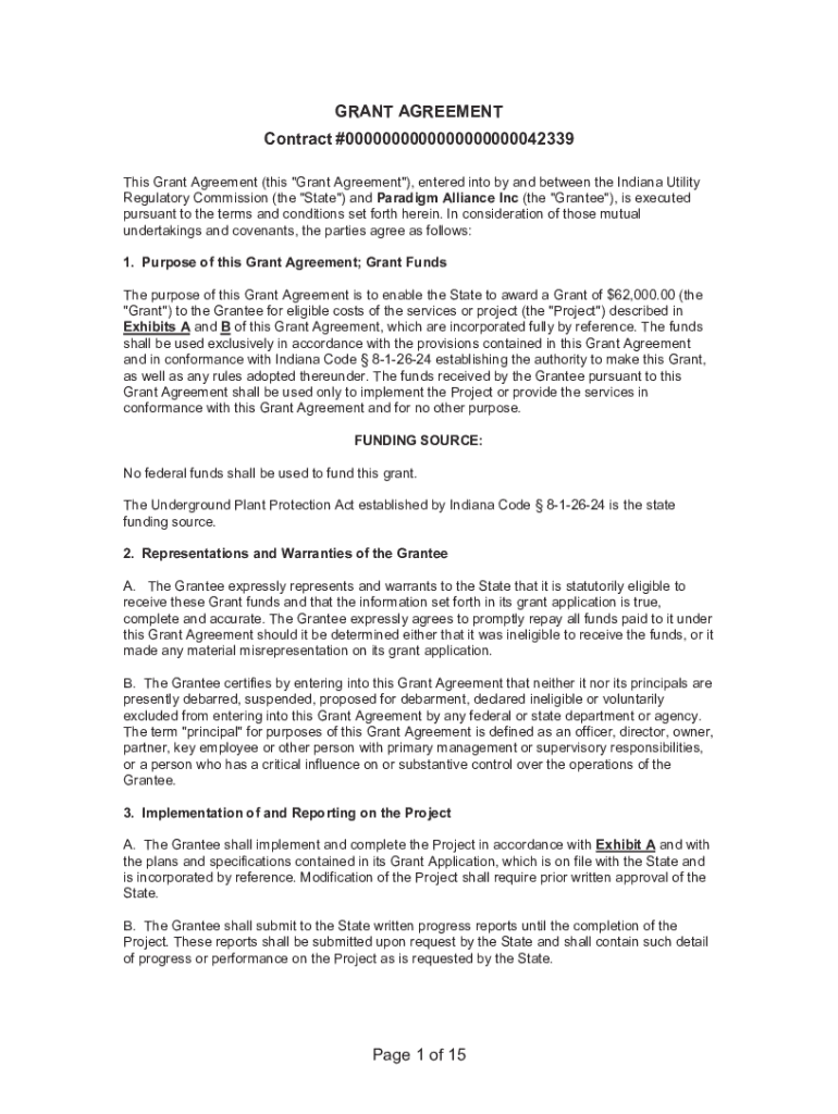 GRANT AGREEMENT Contract #0000000000000000000042339 This Grant Agreement (this \” Grant Agreement\”), entered into by and between the Indiana Utility Regulatory Commission (the \” State\”)