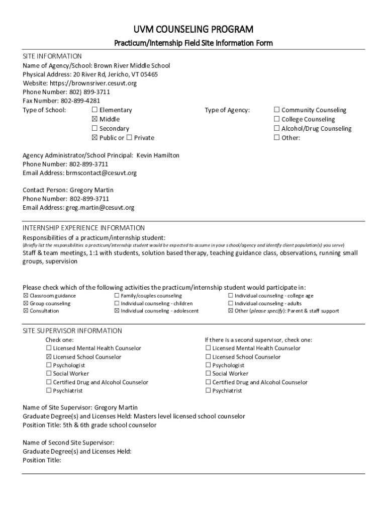 Get the free UVM Counseling Program - Practicum/Internship Field Site Information Form. Brown Riv...