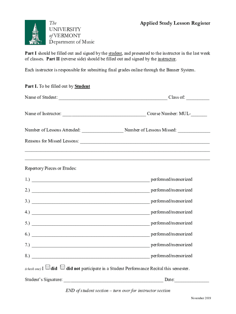 The UNIVERSITY of VERMONT Department of Misapplied Study Lesson Registrar I should be filled out and signed by the student, and presented to the instructor in the last week of classes. Part II (reverse
