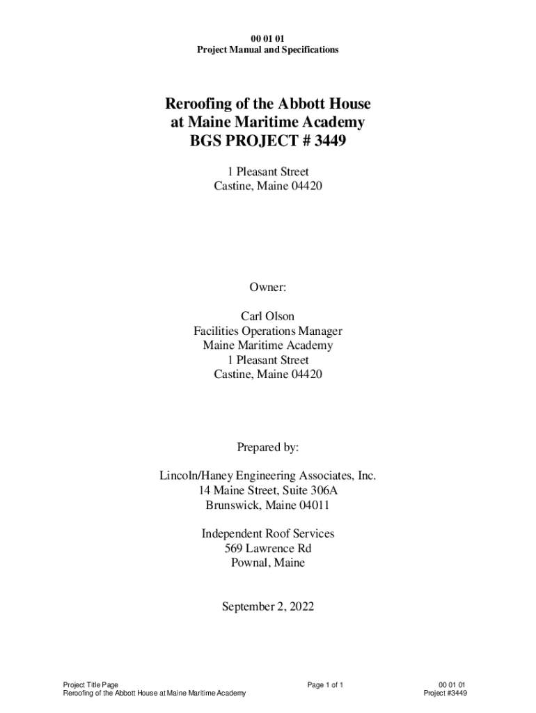 00 01 01 Project Manual and SpecificationsReroofing of the Abbott House at Maine Maritime Academy BGS PROJECT # 3449 1 Pleasant Street Casting, Maine 04420Owner: Carl Olson Facilities Operations Manager