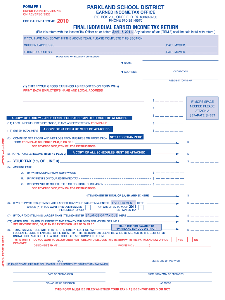 This form is used by residents of Parkland School District to file their earned income tax return for the calendar year. It requires information such as gross earnings, deductions, and any tax payments