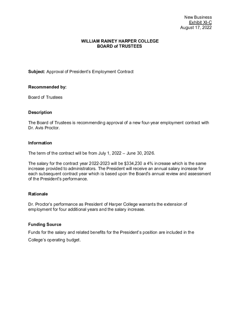 New Business Exhibit XIC August 17, 2022, WILLIAM RAINY HARPER COLLEGE BOARD of TRUSTEESSubject: Approval of Presidents Employment Contract Recommended by: Board of Trustees Description The Board