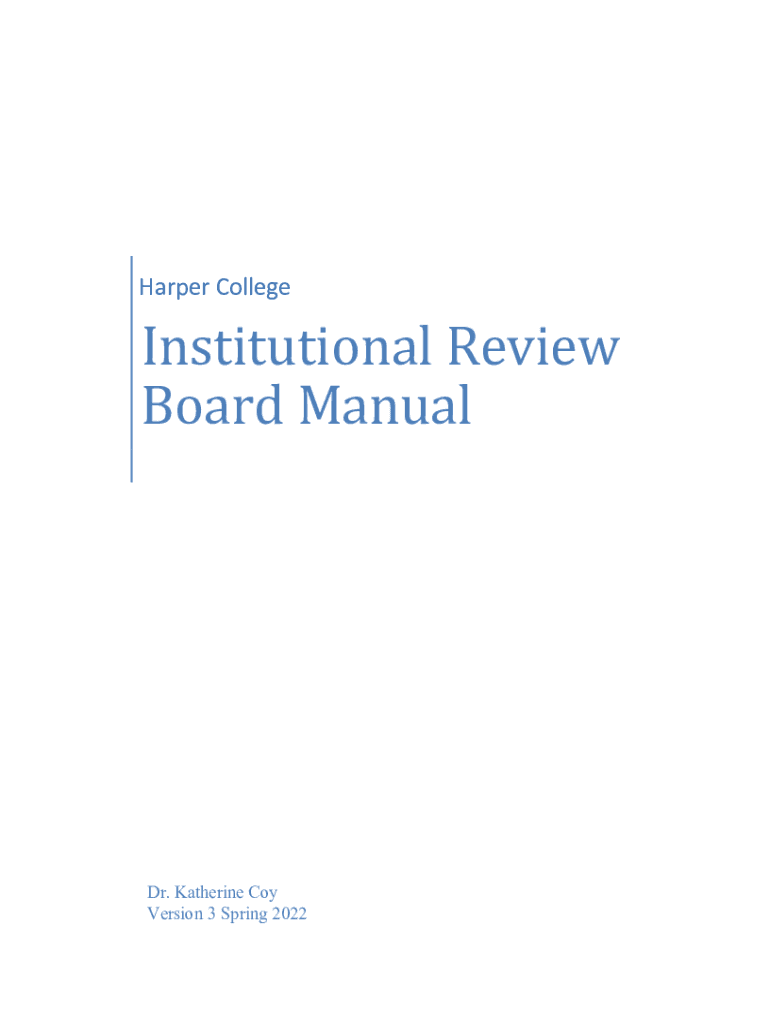 Harper CollegeInstitutional Review Board Manual Dr. Katherine Coy Version 3 Spring 2022Institutional Review Board (IRB) Authority: US Department of Health and Human Services 45CFR, Part 46 Policy: