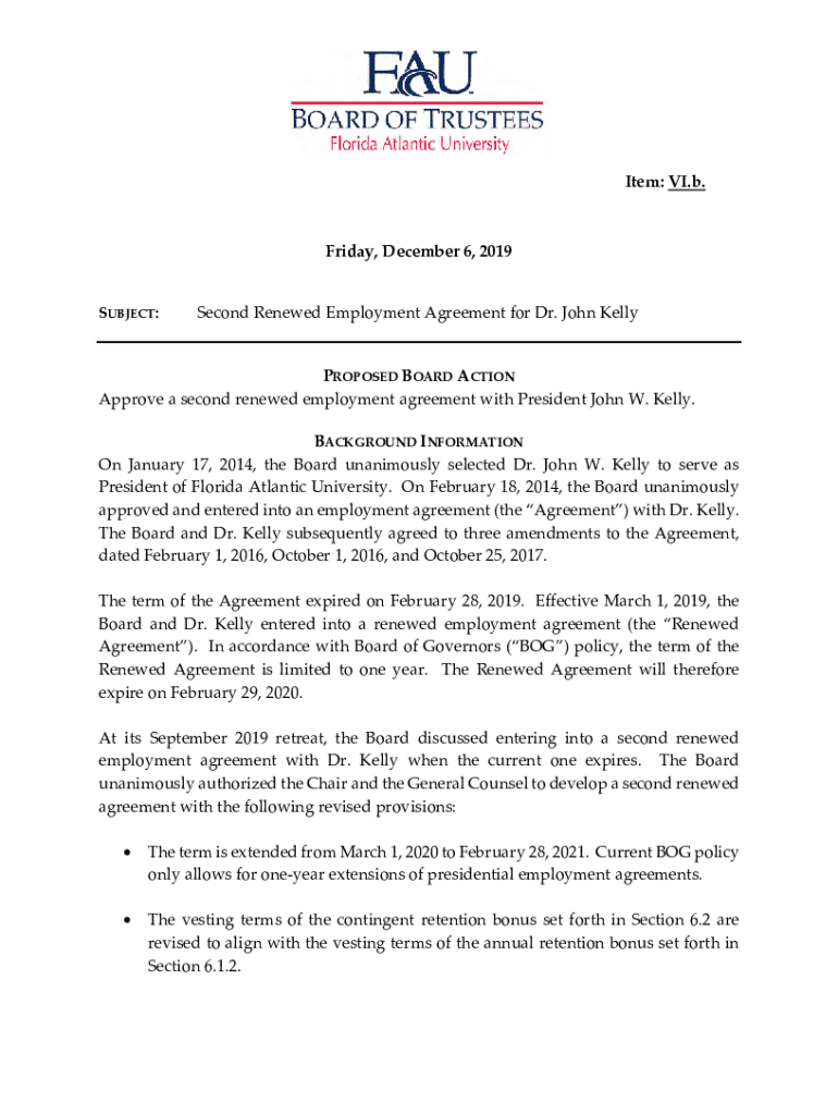 Item: VI.b. Friday, December 6, 2019, SUBJECT:Second Renewed Employment Agreement for Dr. John KellyPROPOSED BOARD ACTION Approve a second renewed employment agreement with President John W. Kelly.