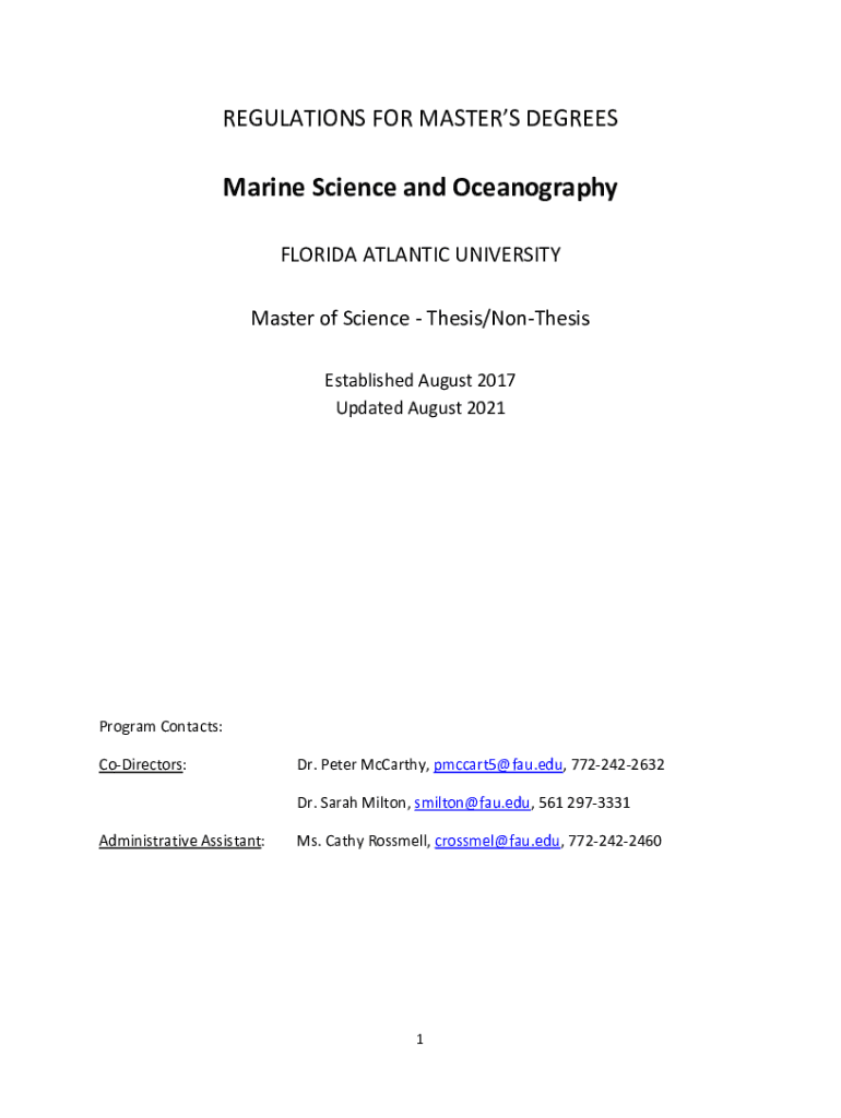 REGULATIONS FOR MASTERS DEGREES Marine Science and Oceanography FLORIDA ATLANTIC UNIVERSITY Master of Science Thesis/Synthesis Established August 2017 Updated August 2021Program Contacts: Co-directors:Dr.